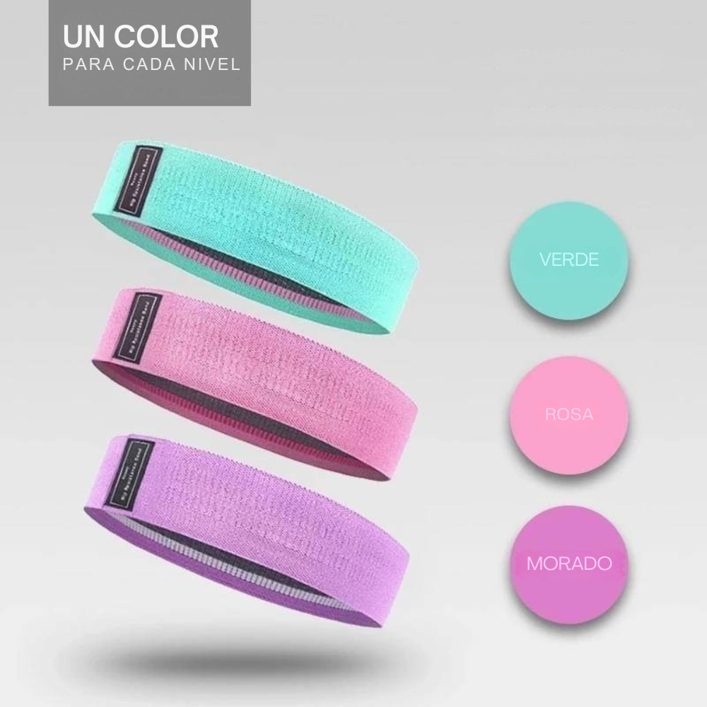 Incluye 3 bandas en distintos niveles: Verde (Ligero), Rosa (Medio), Morado (Pesado), más bolsa de transporte e instructivo.