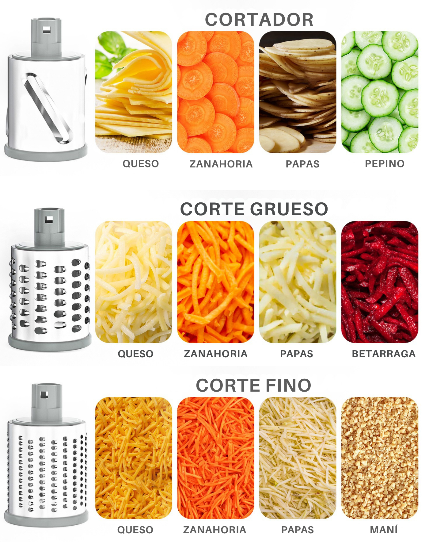 Fino, grueso y rebanado en tambores intercambiables. Mantienen el filo, no se oxidan y cambias de corte en segundos según la receta.