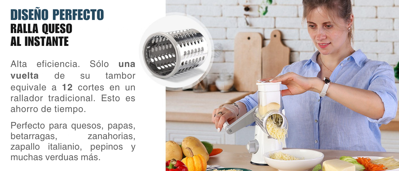 En BazarSmart® nos preocupamos por ofrecerte productos que combinan calidad, diseño y funcionalidad. Nuestro TurboCutter 3-en-1 fue seleccionado para simplificar tu cocina diaria: ralla, corta y rebana en segundos con sus 3 cuchillas de acero inoxidable, mientras su base de succión con bloqueo mantiene todo firme y seguro. Es rápido de montar, fácil de limpiar (piezas desmontables) e ideal para queso, verduras, frutas y frutos secos. Tip de uso: para máxima sujeción, humedece levemente la superficie lisa antes de bloquear; usa un bowl bajo para recoger mejor y, para mozzarella de baja humedad, elige el tambor grueso.